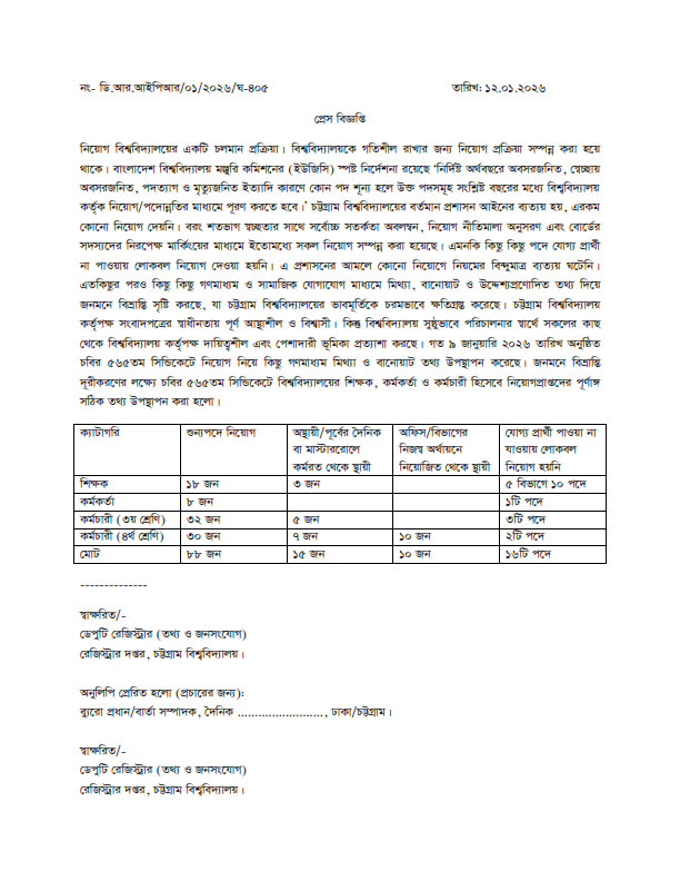 | 09-03-2025 | চট্টগ্রাম বিশ্ববিদ্যালয়ের বর্ণিত শূন্যপদসমূহ পূরণের জন্য বাংলাদেশী নাগরিকদের নিকট হতে নির্ধারিত ফরমে দরখাস্ত আহ্বান করা যাচ্ছে | বিস্তারিত দেখুন |