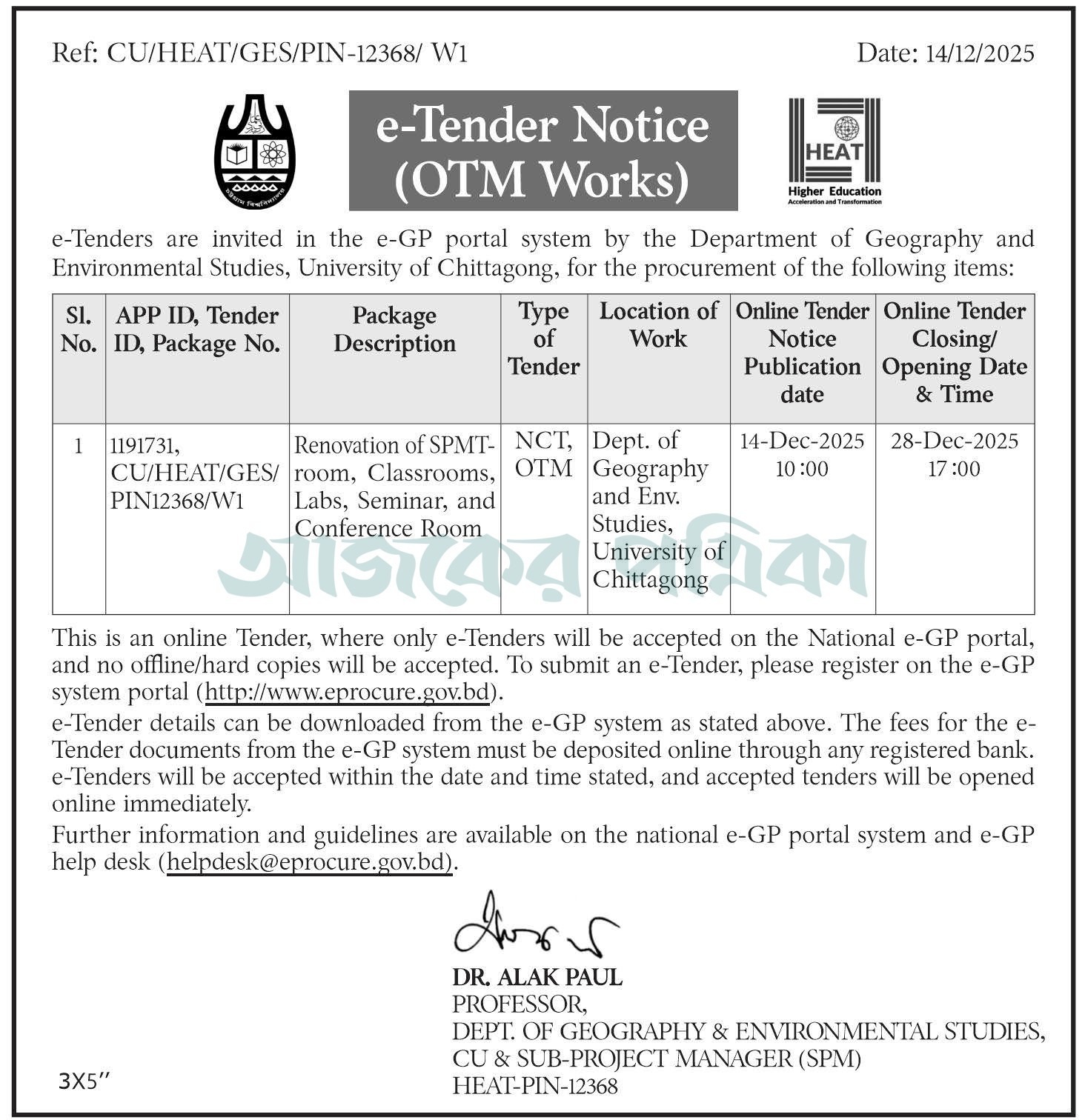 | 12-11-2025 | e-Tender Notice HEAT-11006-CU/2025-2026 (Department of Biochemistry and Molecular Biology, University of Chittagong) | বিস্তারিত দেখুন |