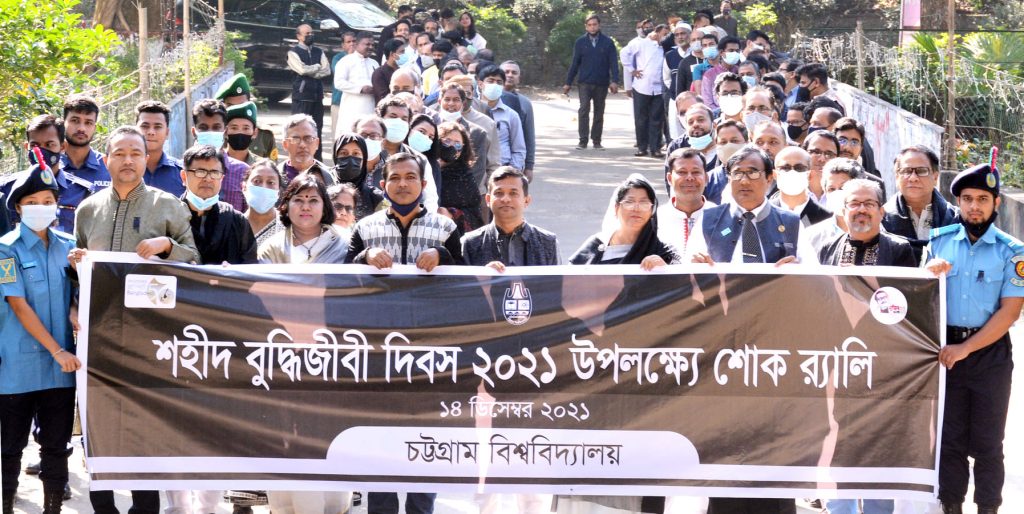 চট্টগ্রাম বিশ্ববিদ্যালয়ের উদ্যোগে যথাযোগ্য মর্যাদা ও ভাবগম্ভীর পরিবেশে ১৪ ডিসেম্বর ২০২১ শহীদ বুদ্ধিজীবী দিবস পালন করা হয়। সকাল ১০:০০ টায় বিশ্ববিদ্যালয়ের শহীদ বুদ্ধিজীবী স্মৃতি সৌধে চট্টগ্রাম বিশ্ববিদ্যালয় পরিবারের সকলকে সাথে নিয়ে পুস্পস্তবক অর্পণ করে দেশ ও জাতির শ্রেষ্ঠ সন্তান শহীদ বুদ্ধিজীবীদের প্রতি শ্রদ্ধা নিবেদন করেন চট্টগ্রাম বিশ্ববিদ্যালয়ের মাননীয় উপাচার্য প্রফেসর ড. শিরীণ আখতার ও মাননীয় উপ-উপাচার্য (একাডেমিক) প্রফেসর বেনু কুমার দে। পুস্পস্তবক অর্পণ শেষে চবি শহীদ বুদ্ধিজীবী স্মৃতি সৌধ চত্বর থেকে শোক র্যালি শুরু হয়ে বঙ্গবন্ধু চত্বরে শেষ হয়। অতঃপর মাননীয় উপাচার্য ও উপ-উপাচার্য বিশ্ববিদ্যালয় পরিবারের সকলকে সাথে নিয়ে জাতির পিতা বঙ্গবন্ধু শেখ মুজিবুর রহমানের প্রতিকৃতিতে পুস্পস্তবক অর্পণ করে শ্রদ্ধা নিবেদন করেন। এরপর চবি উপাচার্য দপ্তরের সভাকক্ষে “শহীদ বুদ্ধিজীবী দিবসের তাৎপর্য” শীর্ষক আলোচনা সভা অনুষ্ঠিত হয়। আলোচনা সভায় প্রধান অতিথি হিসেবে উপস্থিত ছিলেন চট্টগ্রাম বিশ্ববিদ্যালয়ের মাননীয় উপাচার্য প্রফেসর ড. শিরীণ আখতার। এতে বিশেষ অতিথি হিসেবে উপস্থিত ছিলেন চবি মাননীয় উপ-উপাচার্য (একাডেমিক) প্রফেসর বেনু কুমার দে। চবি রেজিস্ট্রার (ভারপ্রাপ্ত) প্রফেসর এস এম মনিরুল হাসানের সভাপতিত্বে এবং চবি প্রক্টর ড. রবিউল হাসান ভূঁইয়ার সঞ্চালনায় আলোচনা সভায় মূল বক্তা হিসেবে বক্তব্য রাখেন চবি বাংলাদেশ স্টাডিজ বিভাগের সভাপতি প্রফেসর ড. মোঃ সেকান্দর চৌধুরী। পুস্পস্তবক অর্পণ, র্যালি এবং আলোচনা সভায় চবি সিনেট ও সিন্ডিকেট সদস্যবৃন্দ, অনুষদের ডিনবৃন্দ, শিক্ষক সমিতির নেতৃবৃন্দ, রেজিস্ট্রার, কলেজ পরিদর্শক, হলের প্রভোস্টবৃন্দ, বিভাগীয় সভাপতি, ইনস্টিটিউট ও গবেষণা কেন্দ্রের পরিচালকবৃন্দ, শিক্ষকবৃন্দ, প্রক্টর ও সহকারী প্রক্টরবৃন্দ, ছাত্র-ছাত্রী নির্দেশনা ও পরামর্শ কেন্দ্রের পরিচালক, অফিস প্রধানবৃন্দ, বঙ্গবন্ধু পরিষদের নেতৃবৃন্দ, অফিসার সমিতি, কর্মচারী সমিতি ও কর্মচারী ইউনিয়নের নেতৃবৃন্দ, চবি সাংবাদিক সমিতির নেতৃবৃন্দ, শিক্ষার্থীবৃন্দ এবং বিশ্ববিদ্যালয় পরিবারের সদস্যবৃন্দ উপস্থিত ছিলেন।