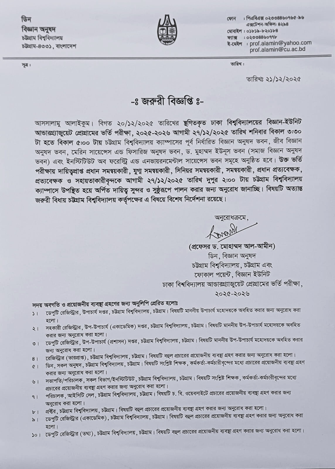 | 04-12-2025 | চট্টগ্রাম বিশ্ববিদ্যালয়ে অনুষ্টিতব্য ঢাকা বিশ্ববিদ্যালয়ের ভর্তি পরীক্ষা সমন্বয় কমিটির ০৩.১২.২০২৫ তারিখে অনুষ্ঠিত সভার সিদ্ধান্ত অনুসারে আগামী ০৬.১২.২০২৫ তারিখ (শনিবার) ঢাকা বিশ্ববিদ্যালয়ের ২০২৫-২০২৬ শিক্ষাবর্ষের ব্যবসায় শিক্ষা ইউনিটের ১ম বর্ষ অনার্স (সম্মান) শ্রেণীর ভর্তি পরীক্ষার দিন শিক্ষক বাসসমূহ নিম্নলিখিত সময়সূচী অনুযায়ী চলাচল করবে | বিস্তারিত দেখুন |